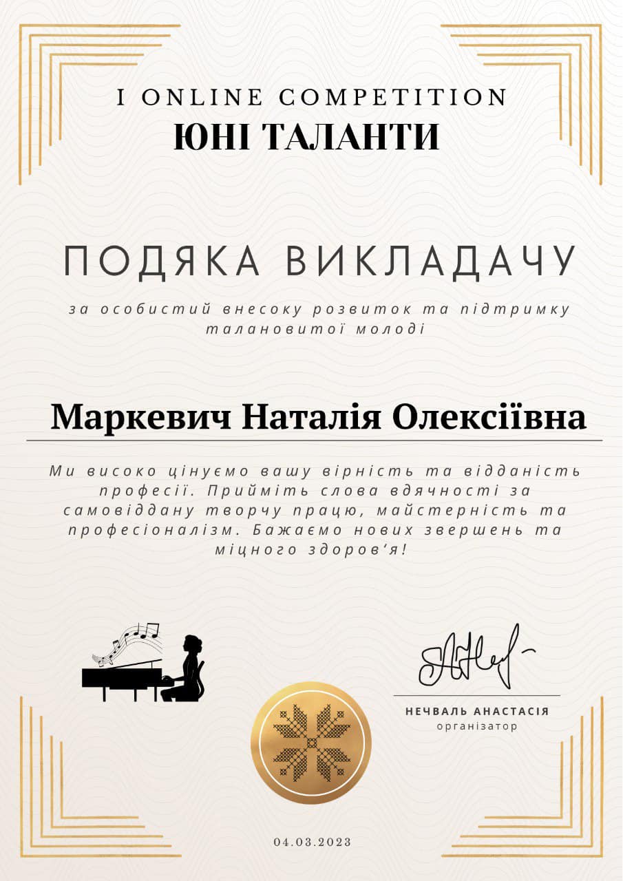 Вітаємо ученицю та викладача класу фортепіано Наталія Маркевич з черговою перемогою!!!