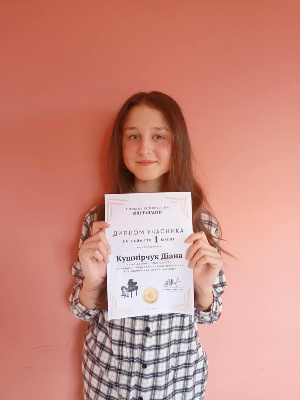 Диплом за зайняте I місце отримала Діана КУШНІРЧУК у онлайн конкурсі “Юні таланти” 2023 м.Чернівці.