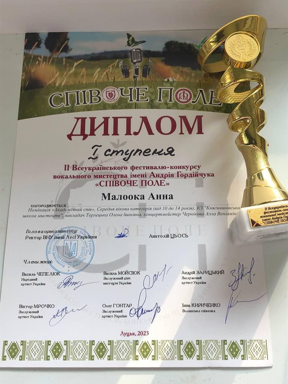 /філія Рокині/ Анну МАЛООКУ, яка здобула перемогу в II Всеукраїнському фестивалі-конкурсі вокального мистецтва імені Андрія Гордійчука “Співоче поле” м.Луцьк 26.05-02.06.2023.