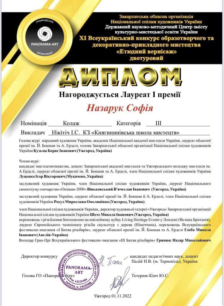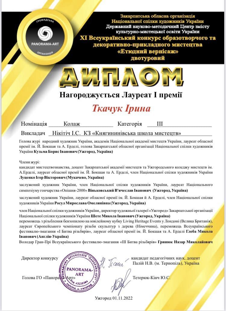 У XI Всеукраїнському конкурсі образотворчого та декоративно-прикладного мистецтва “Етюдний вернісаж” (м. Ужгород) дипломи отримали: