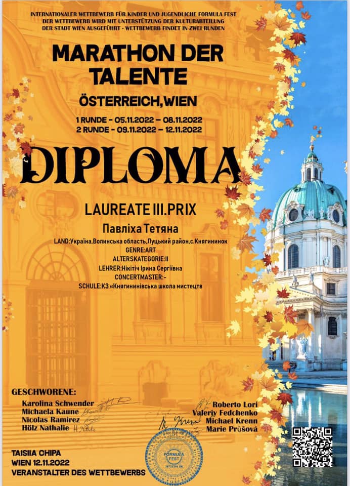 У Міжнародному благодійному конкурсі мистецтв “Формула успіху – марафон талантів” (м.Відень) Диплом лауреата ІІІ премії здобула Тетяна Павліха.