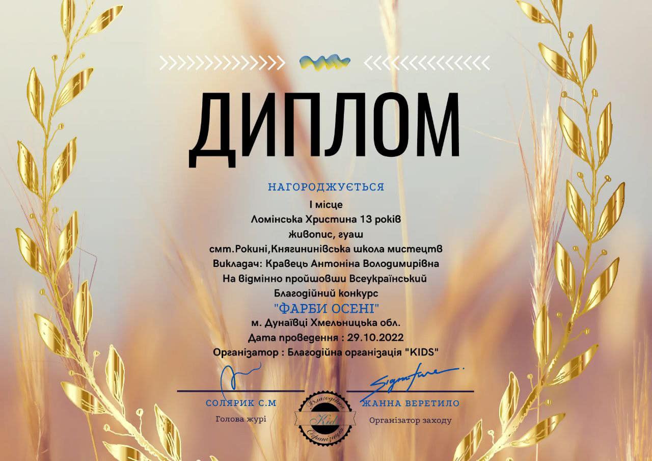 Скарбничку наших маленьких перемог поповнили учні класу образотворчого мистецтва філії РОКИНІ, взявши участь у Всеукраїнському благодійному конкурсі “Фарби осені” м. Дунаївці Хмельницька обл., викладач Антоніна Кравець.