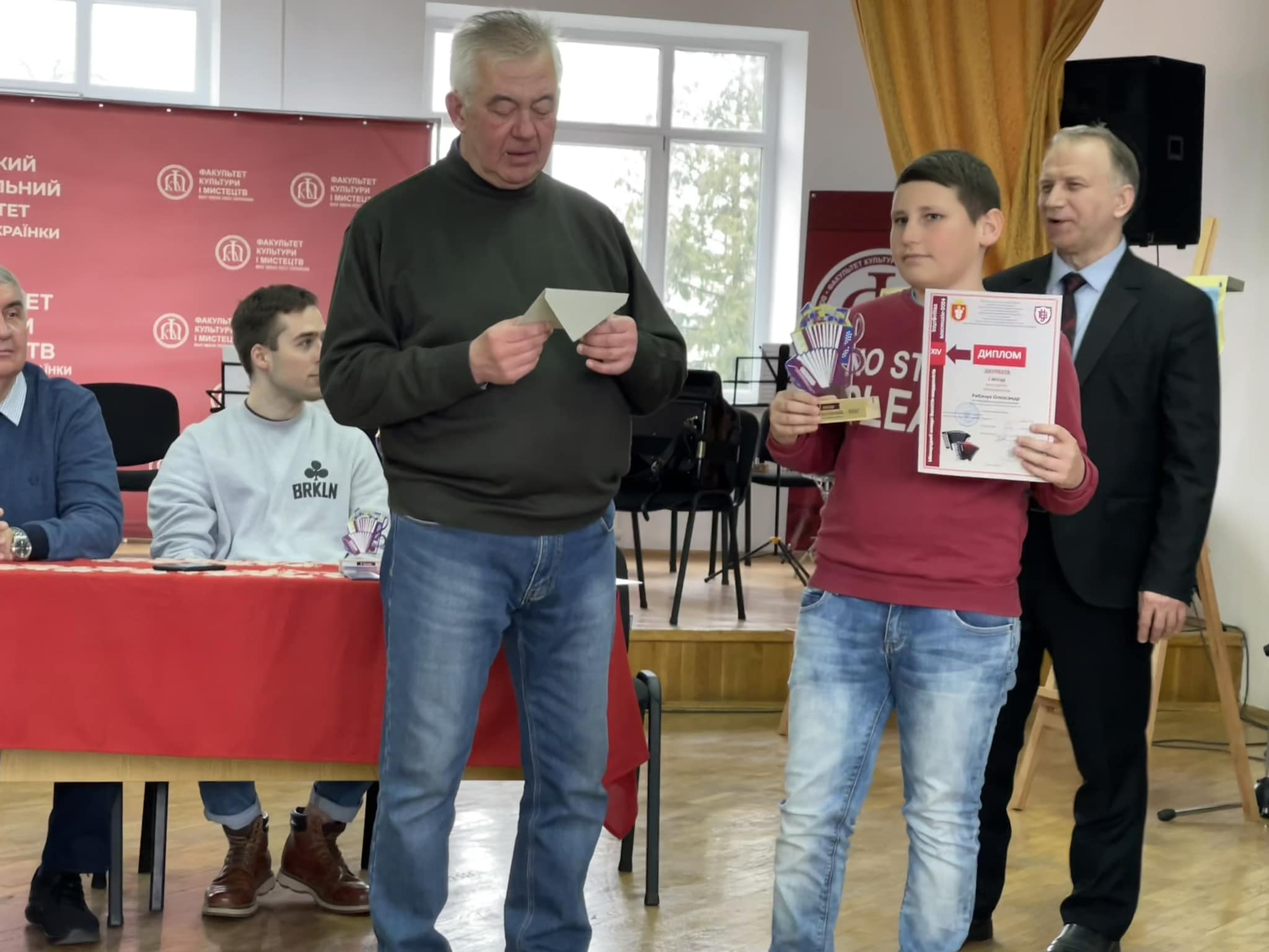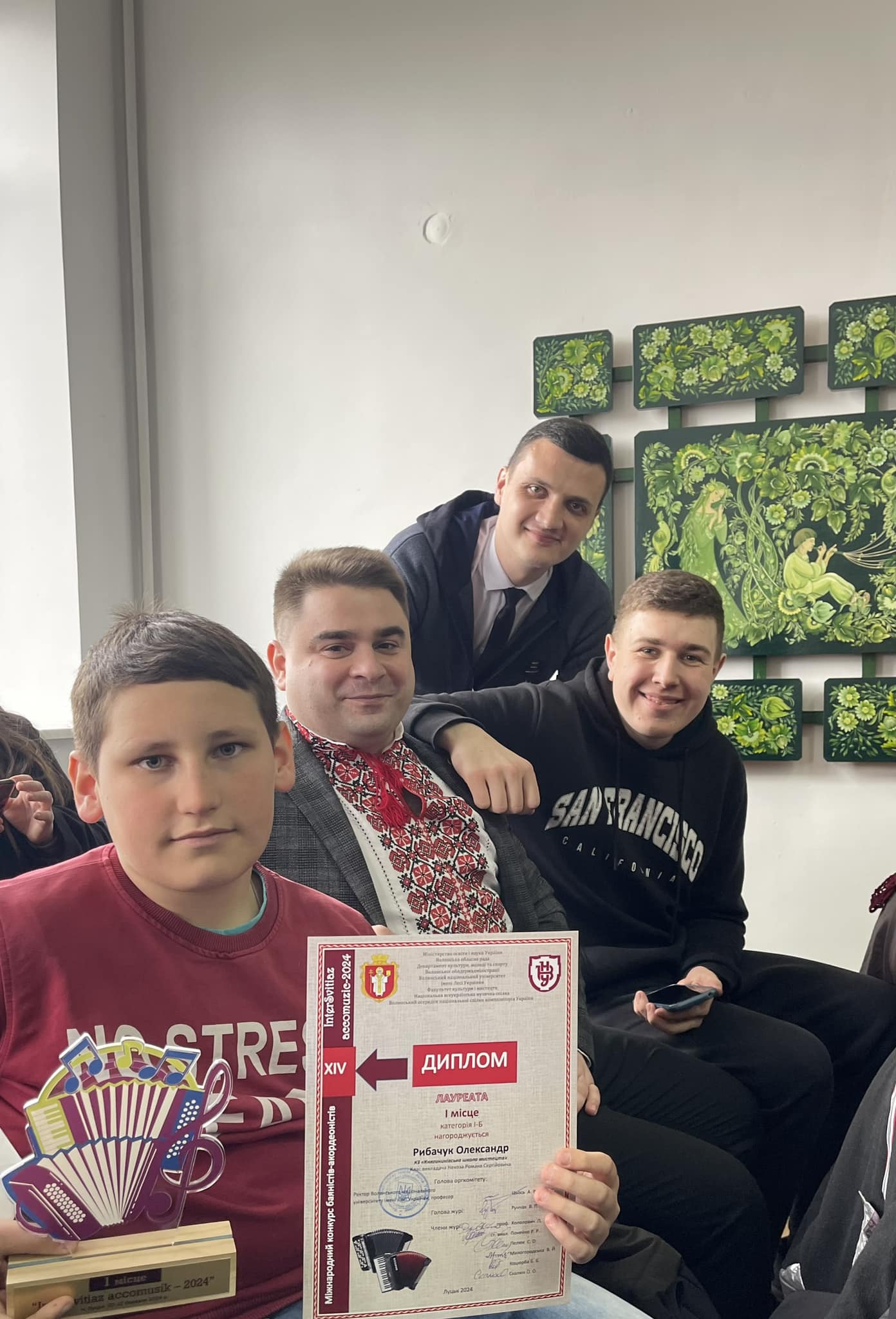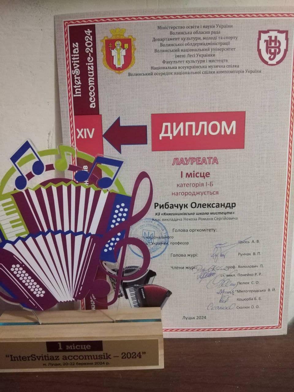 Олександр РИБАЧУК – учень КНЯГИНИНІВСЬКОЇ ШКОЛИ МИСТЕЦТВ філія с. Рокині у МІЖНАРОДНОМУ КОНКУРСІ БАЯНІСТІВ-АКОРДЕОНІСТІВ «INTERSVITIAZ ACCOMUZIC – 2024», м. Луцьк – виборов І місце та нагороджений “ПРИЗОМ РОДИНИ ЩЕГЕЛЬСЬКИХ”!