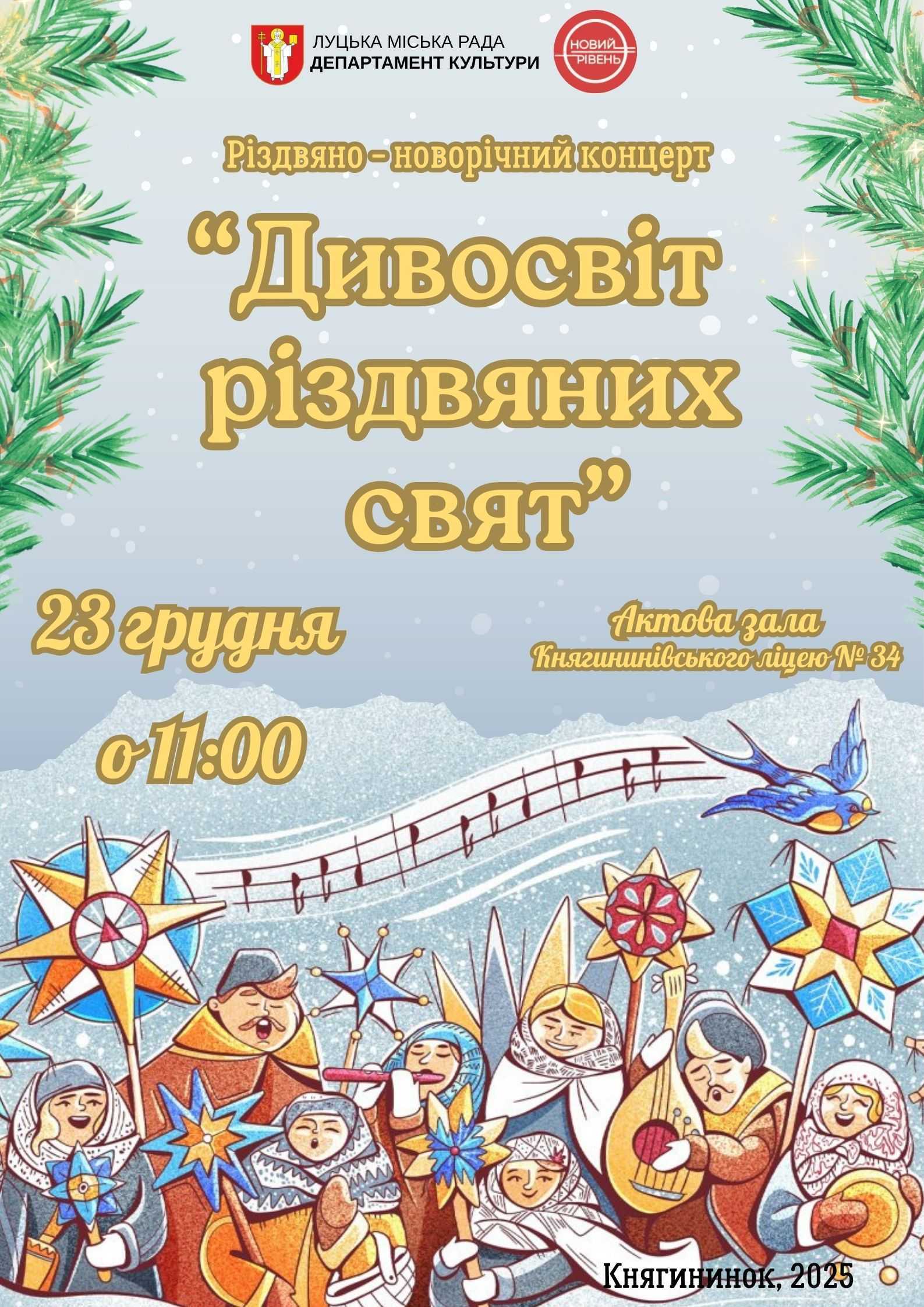 З великими святами, насамперед, вітають хороших, близьких друзів . Тож традиційно 23 грудня 2025 року учні та викладачі КНЯГИНИНІВСЬКОЇ ШКОЛИ МИСТЕЦТВ завітали в Княгининівський ліцей № 34 з різдвяно-новорічною концертною програмою «Дивосвіт різдвяних свят», наповнили простір святкової концертної зали чарівними мелодіями колядок, щедрівок, зимових пісень, вихором танців, теплом своїх сердець і щирими посмішками.