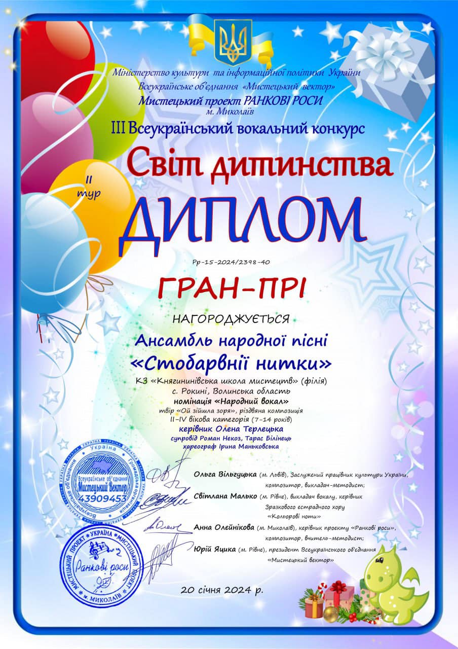 - Ансамбль народної пісні «Стобарвнії нитки» – Гран-прі.