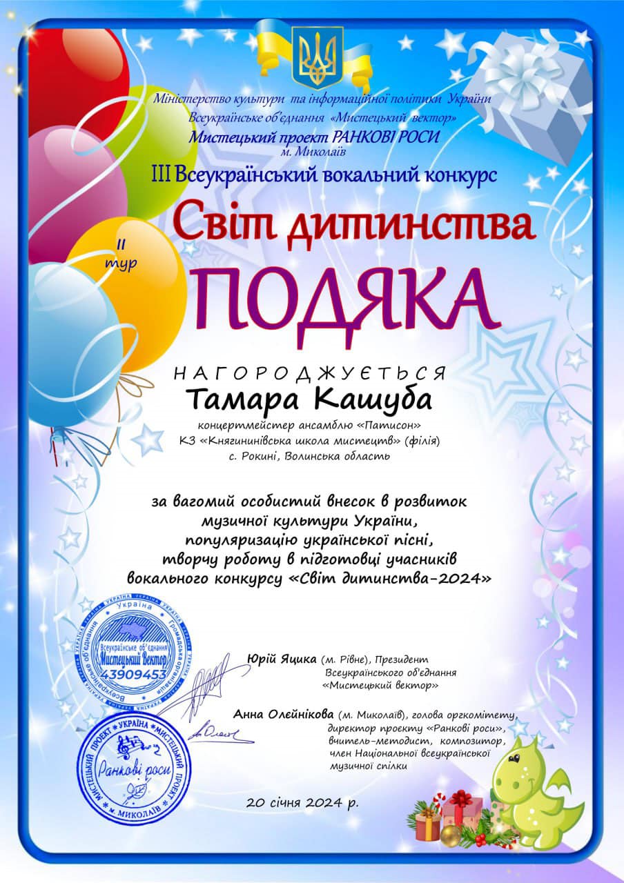 Вітаємо учнів КНЯГИНИНІВСЬКОЇ ШКОЛИ МИСТЕЦТВ філії селища Рокині: