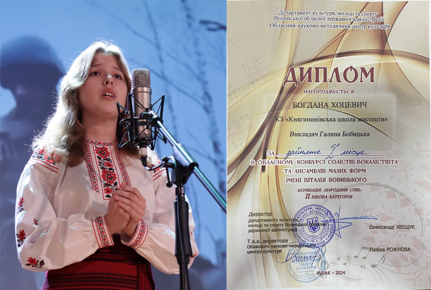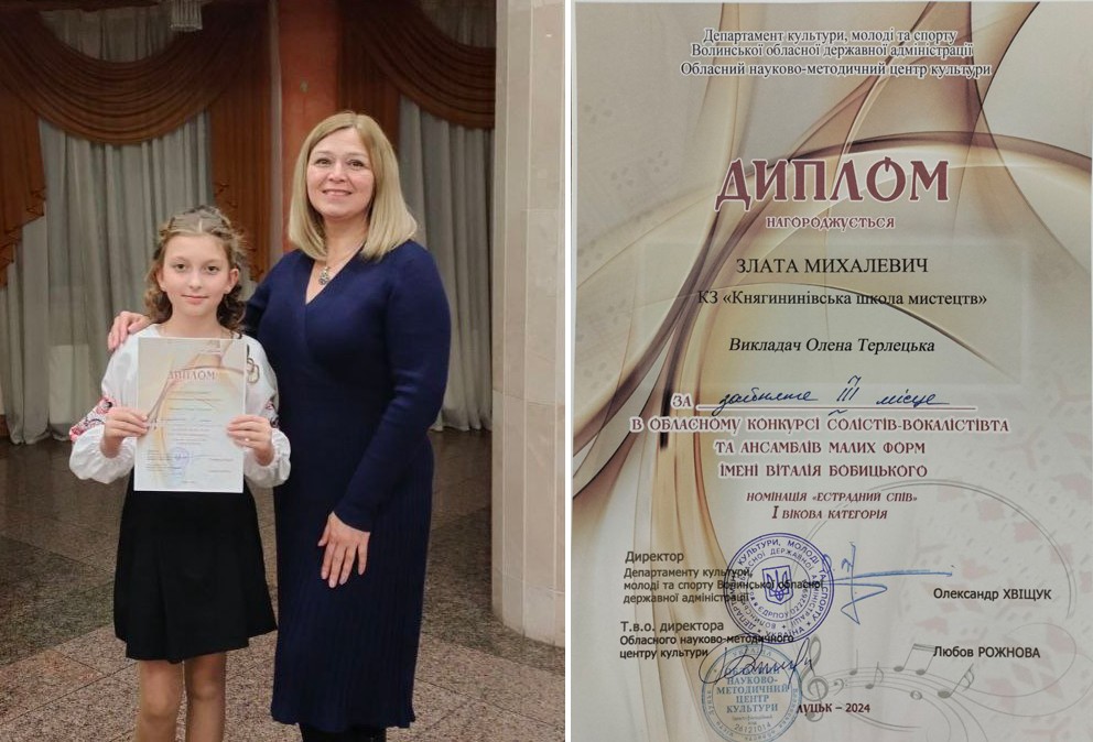 До нього ретельно готувалися учні КНЯГИНИНІВСЬКОЇ ШКОЛИ МИСТЕЦТВ і – недаремно. Богдана ХОЦЕВИЧ виборола І місце у номінації «народний спів» -2 вікова категорія, викладач Галина БОБИЦЬКА, Злата МИХАЛЕВИЧ здобула ІІІ місце у номінації «естрадний спів» – 1 вікова категорія, викладач Олена ТЕРЛЕЦЬКА. Щиро вітаємо і зичимо творчих злетів!