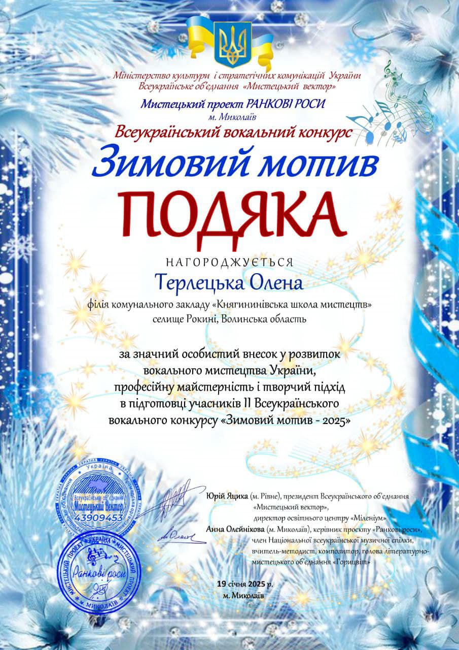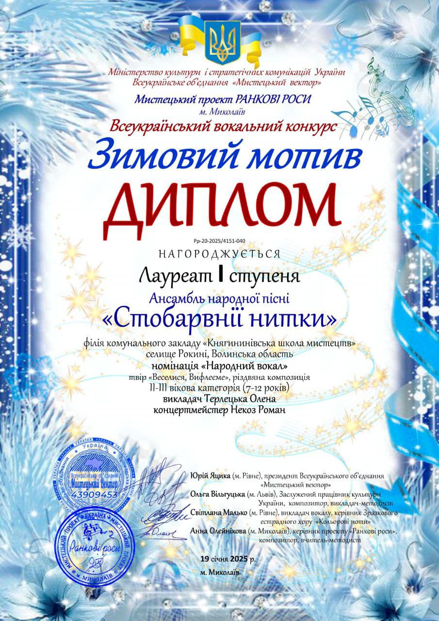 Вітаємо ансамбль народної пісні «Стобарвні нитки» КНЯГИНИНІВСЬКОЇ ШКОЛИ МИСТЕЦТВ з перемогою у Всеукраїнському вокальному конкурсі «Зимовий мотив»!